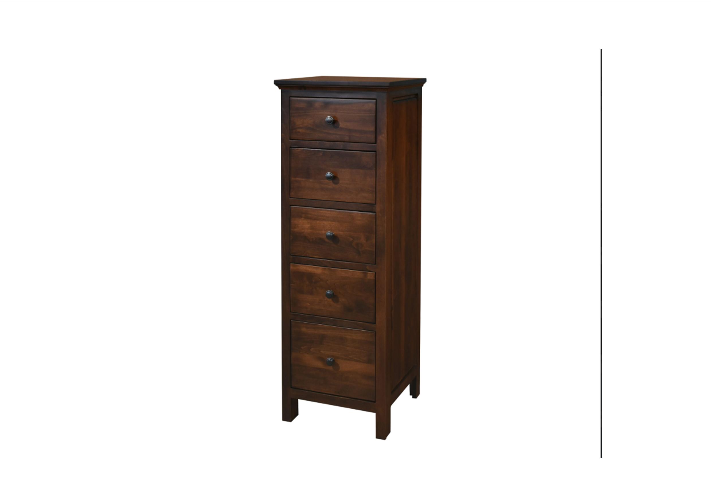 The Alder Heritage Five Drawer Lingerie Chest offers a sturdy design that brings a timeless quality to your room. It includes five roomy drawers featuring English dovetails and solid wood drawer boxes. In addition, all drawers sit on full-extension, ball-bearing glides. The deep bottom drawer allows for storage of larger items. The sides of this chest feature a raised panel detail that offers a subtle elegance to this traditional piece. This chest ships unfinished or in your choice of 14 stains, 12 matte paint options, and 1 gloss paint option. Further customize this piece with your choice of 7 different knob options. This model is updated to meet ASTM anti-tipping standards. It pairs well with any of the pieces in the Heritage Collection, but is versatile enough to combine with other pieces as well.