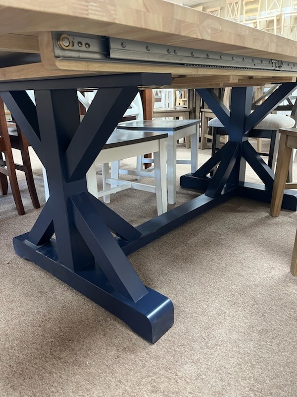 This table is a floor model and on Clearance for 50% off. The top is in the Wheat finish with self-storing leaf and the Sierra base is in the Denim finish. While not very noticeable, there is a hairline blemish on the top corner. This table is sold as-is and available for local pickup or local delivery.