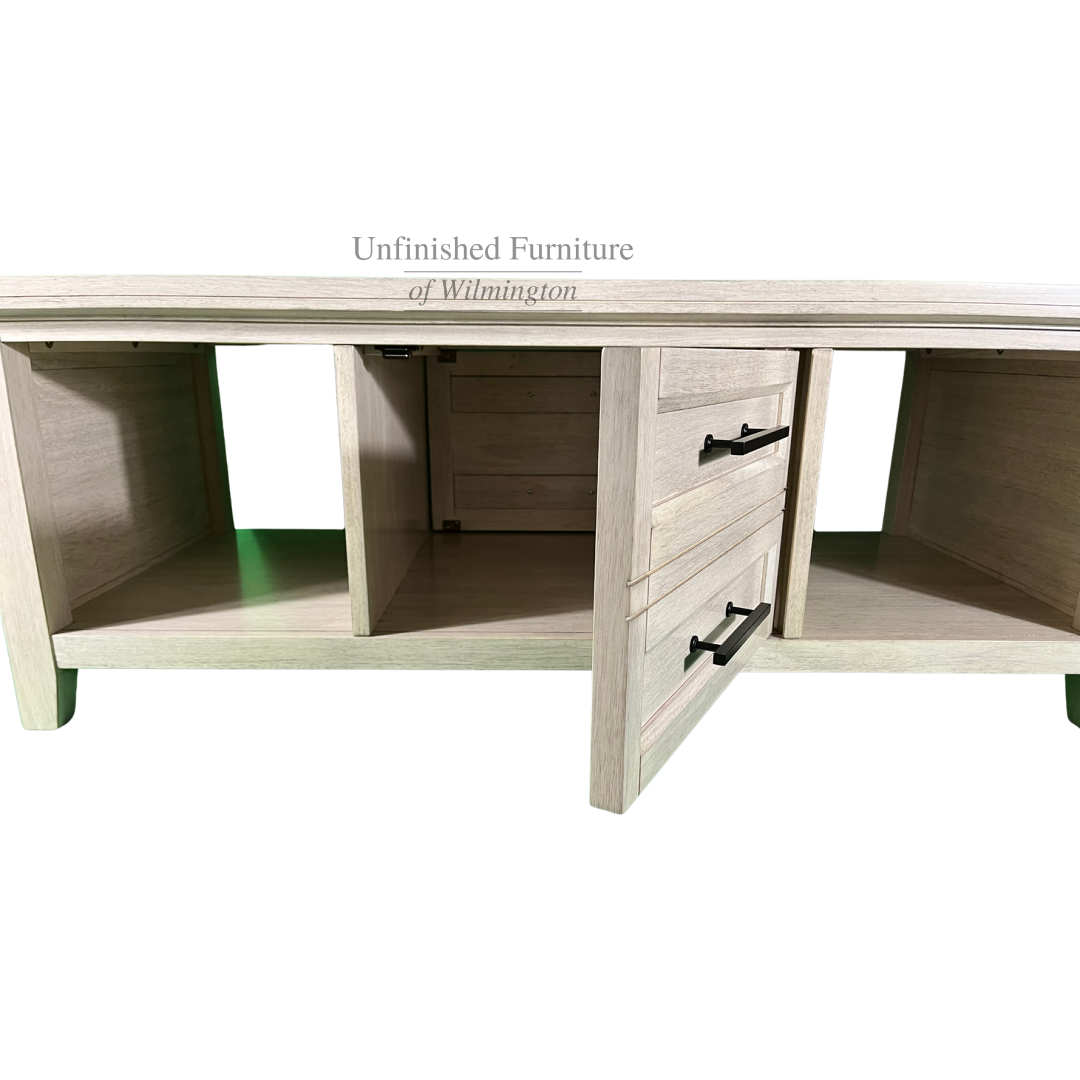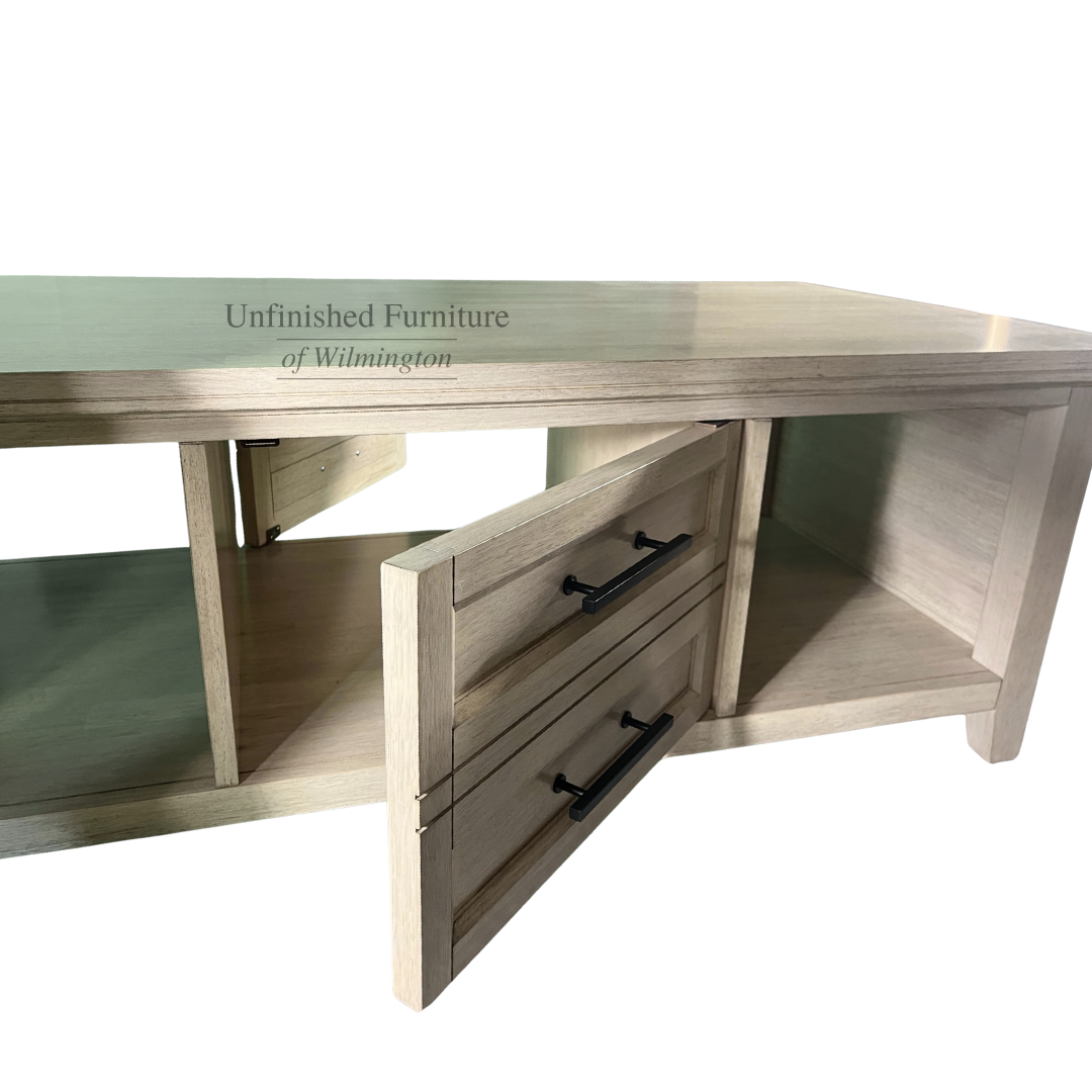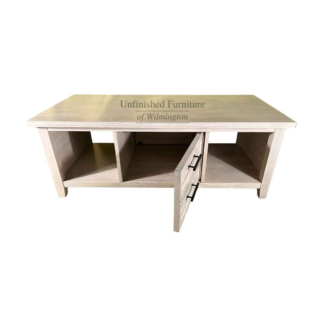 The Sanibel Coffee Table features a unique design that looks beautiful in any living space. The center doors gives the appearance of two drawers, but open to reveal a concealed storage area that is accessible on both sides. The timeless look complements any home decor style ranging from traditional and transitional to cottage and modern farmhouse. The beadboard sides also add visual interest with a casual feel. The Sanibel Coffee Table ships unfinished or in a Macchiato finish (96). The finished piece features solid zinc die-cast hardware which offers a beautiful contrast to the cool finish. Made from solid, eco-friendly Parawood, this coffee table offers excellent strength and durability. Pair this coffee table with any of the pieces in the Sanibel Collection or combine with other collections to create an eclectic look. For the same look in your bedroom, view the Sanibel Bedroom Collection.